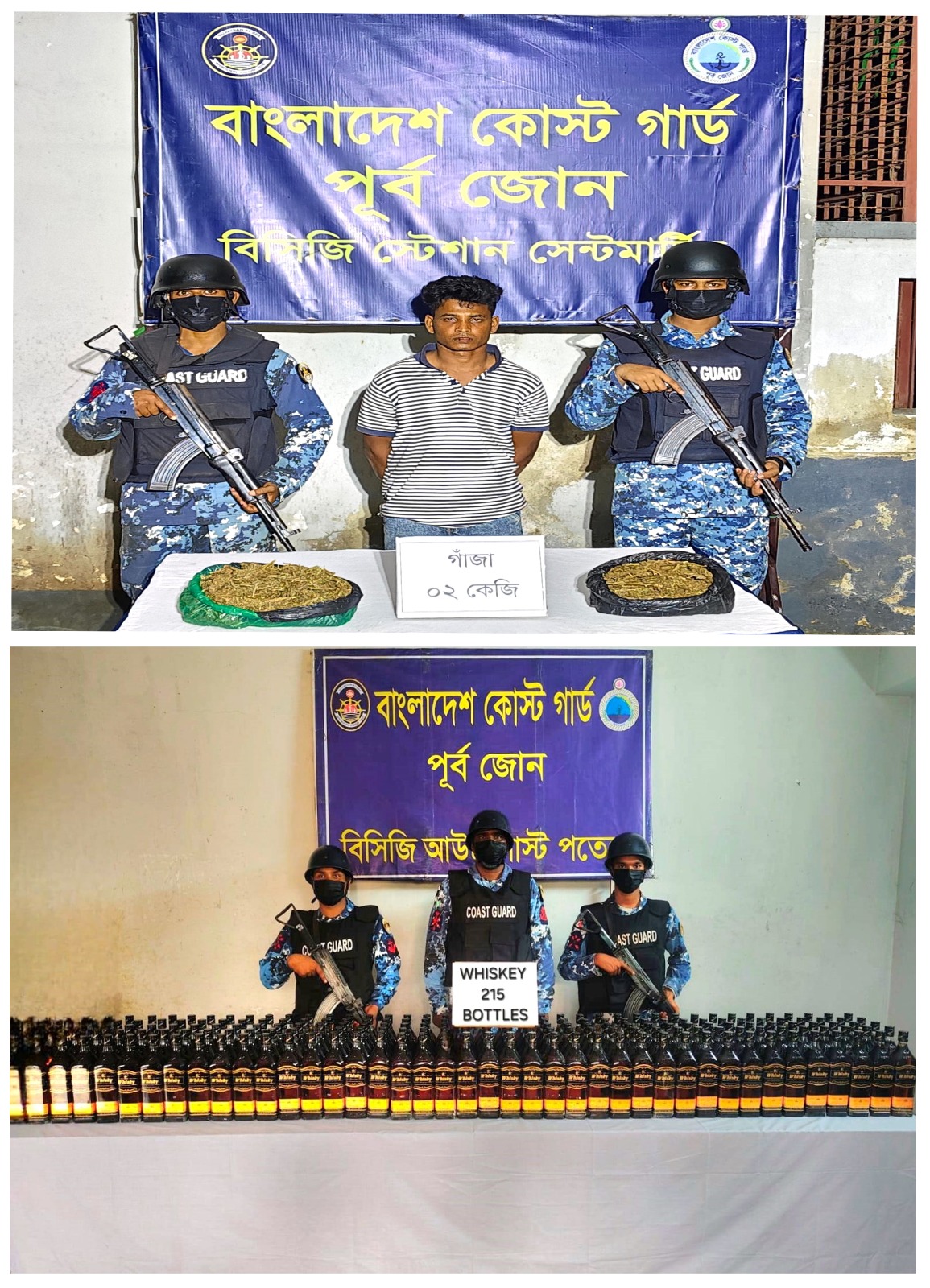 সেন্টমার্টিন ও চট্টগ্রামে কোস্ট গার্ডের পৃথক ২টি অভিযান; বিপুল পরিমাণ গাঁজাসহ ১ মাদক কারবারি আটক ও বিদেশি মদ জব্দ।