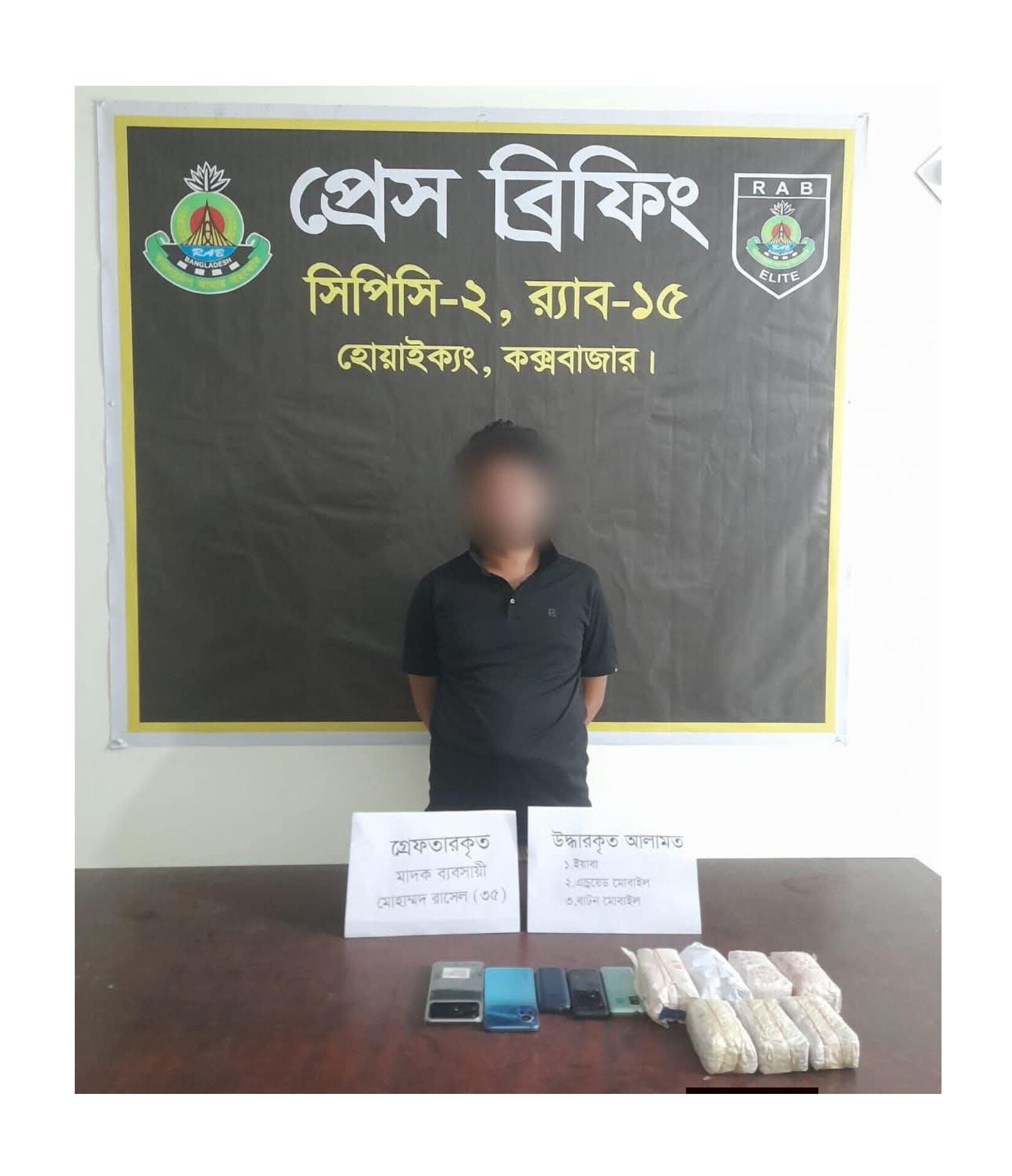 অভিযান চলাকালীন র‌্যাবের উপস্থিতি টের পেয়ে পালানোর চেষ্টাকালে মোহাম্মদ রাসেল (৩৫) নামে এক ব্যক্তিকে গ্রেফতার করা হয়। পরবর্তীতে উপস্থিত সাক্ষীদের সামনে তার হেফাজত থেকে মোট ১৪,০০০ (চৌদ্দ হাজার) পিস ইয়াবা ট্যাবলেট এবং মাদক কেনাবেচায় ব্যবহৃত ০৫(পাঁচ)টি মোবাইল ফোন উদ্ধার করা হয়।